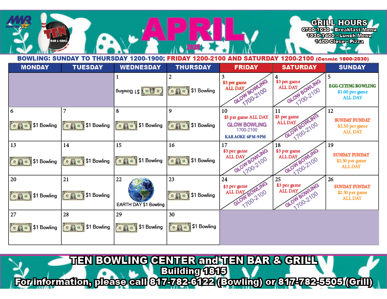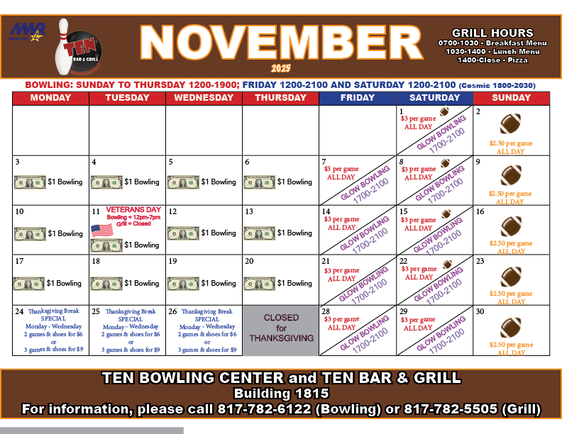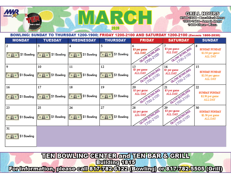The TEN Bowling Center features 10 USBC-certified lanes with Qubica AMF pinsetters and automatic scoring. Food and drinks are available for purchase from the Grill located inside the bowling center. Reservations (at least one week in advance) are required for large groups. To make a group reservation, please call 817-782-6122.